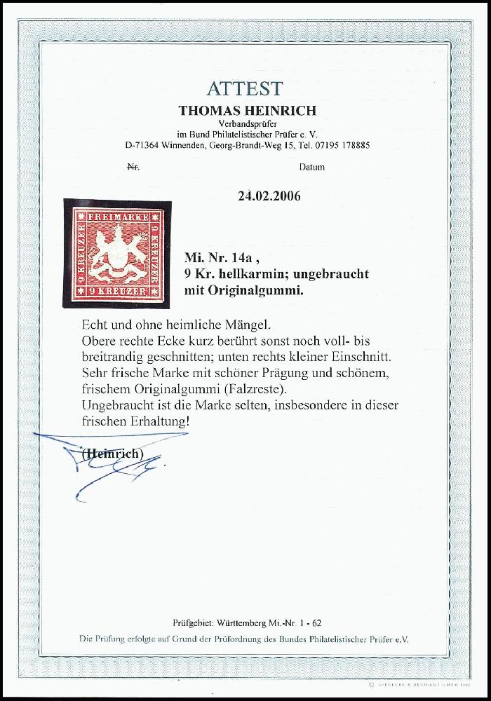 | Zusatzinformationen und Suchstichworte: | Dr. Reinhard Fischer 188. Auktion 1. - 3. September 2022 Los 1398 Altdeutschland Württemberg 9 Kreuzer hellkarmin, farbfrisches und für diese Ausgabe gut geschnittenes Exemplar (obere rechte Ecke kurz berührt sonst noch voll- bis breitrandig), unten rechts kleiner Einschnitt, Fotoattest Heinrich BPP: "Ungebraucht ist die Marke selten, insbesondere in dieser frischen Erhaltung!", Mi. 1.600.- Zuschlag 560,00 EUR |