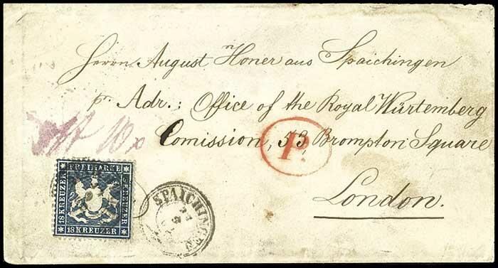 | Zusatzinformationen und Suchstichworte: | Dr. Reinhard Fischer 188. Auktion 1. - 3. September 2022 Los 1405 Altdeutschland Württemberg 18 Kr. dunkelblau mit Dkr. "SPAICHINGEN 11.9.62" auf Brief via Ostende nach London, die Marke nicht ursprünglich haftend, aber zum Brief gehörend, Zahnkorrekturen und rechter Rand repariert, der Brief hat übliche Altersspuren und die Oberklappe fehlt, sehr seltene Einzelfrankatur, Fotoattest Irtenkauf BPP, Mi. 7500,- Zuschlag 560,00 EUR |