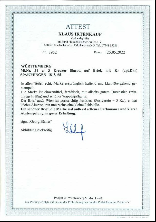 | Zusatzinformationen und Suchstichworte: | Dr. Reinhard Fischer 188. Auktion 1. - 3. September 2022 Los 1413 Altdeutschland Württemberg 3 Kr. lilarot mit allseits gutem, minimal unregelmäßigem Druckstich auf Brief von "SPAICHINGEN 18.8.68" nach Wien, der Brief hat leichte Altersspuren und rechts eine kleine Fehlstelle, sehr seltener Beleg, Fotoatteste Bühler und Irtenkauf BPP Zuschlag 1.400,00 EUR |