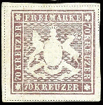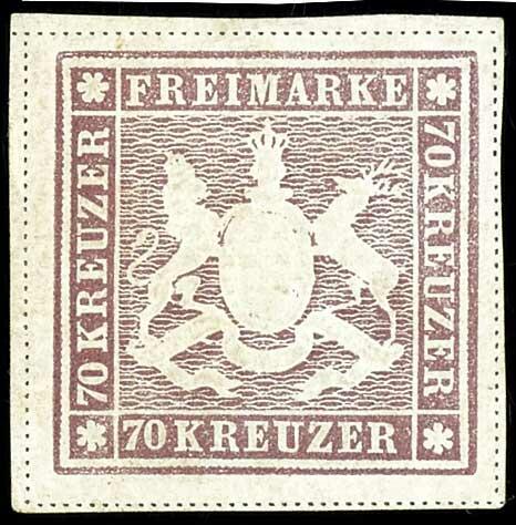 | Zusatzinformationen und Suchstichworte: | Dr. Reinhard Fischer 188. Auktion 1. - 3. September 2022 Los 1428 Altdeutschland Württemberg 70 Kreuzer rotlila, Bogenfeld 1, farbfrisches und vollrandiges Kabinettstück mit schwarzen Trennungslinien an zwei Seiten, ungebraucht mit Originalgummierung, Fotoattest Thoma BPP: "Einwandfreies, schönes Stück", Mi. 2.300.- Ausruf 750,00 EUR |
