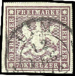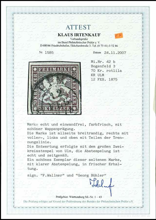 | Zusatzinformationen und Suchstichworte: | Dr. Reinhard Fischer 188. Auktion 1. - 3. September 2022 Los 1429 Altdeutschland Württemberg 70 Kreuzer rotlila, Bogenfeld 3, farbfrisches und vollrandiges Kabinettstück, entwertet mit Dkr. "ULM 12. FEB 1875", Fotoattest Irtenkauf BPP: "echt und einwandfrei", Mi. 5.000.- Ausruf 1.700,00 EUR |