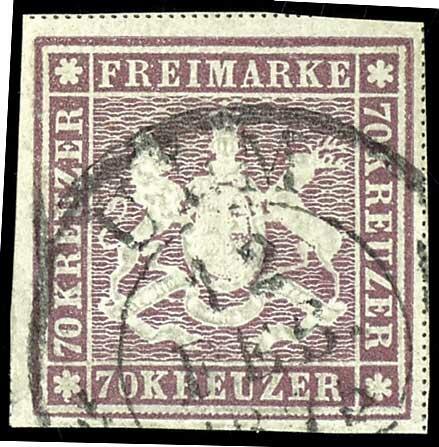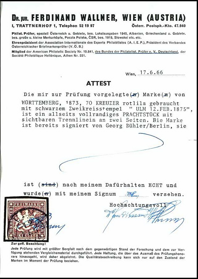 | Zusatzinformationen und Suchstichworte: | Dr. Reinhard Fischer 188. Auktion 1. - 3. September 2022 Los 1429 Altdeutschland Württemberg 70 Kreuzer rotlila, Bogenfeld 3, farbfrisches und vollrandiges Kabinettstück, entwertet mit Dkr. "ULM 12. FEB 1875", Fotoattest Irtenkauf BPP: "echt und einwandfrei", Mi. 5.000.- Ausruf 1.700,00 EUR |