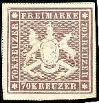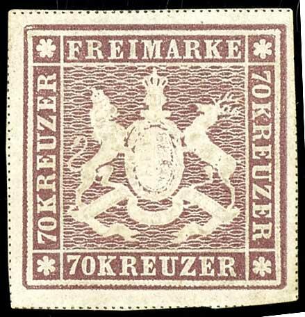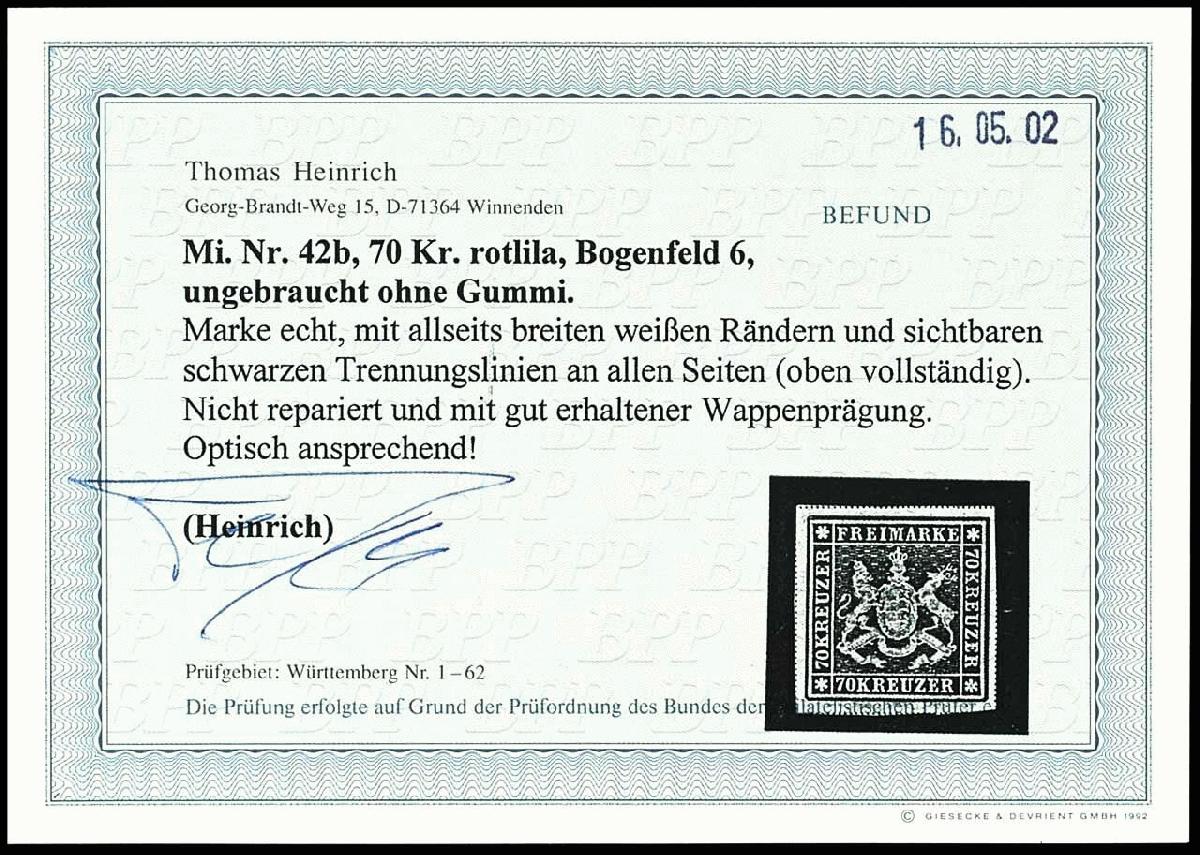 | Zusatzinformationen und Suchstichworte: | Dr. Reinhard Fischer 188. Auktion 1. - 3. September 2022 Los 1430 Altdeutschland Württemberg 70 Kreuzer rotlila, Bogenfeld 6, farbfrisches und vollrandiges Exemplar mit schwarzen Trennungslinien an allen Seiten (oben vollständig), ungebraucht ohne Gummierung, Fotobefund Heinrich BPP: "Nicht repariert und mit gut erhaltener Wappenprägung. Optisch ansprechend", Mi. 2.300.- für * Zuschlag 460,00 EUR |