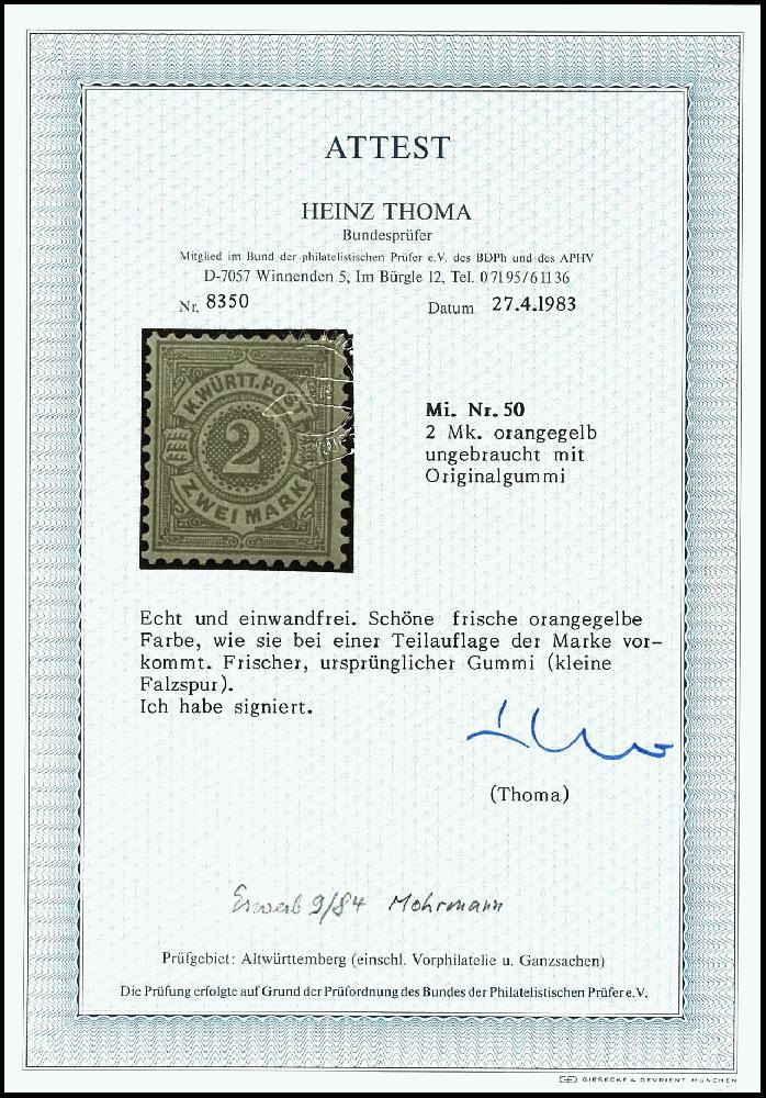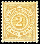 | Zusatzinformationen und Suchstichworte: | Dr. Reinhard Fischer 188. Auktion 1. - 3. September 2022 Los 1434 Altdeutschland Württemberg 2 Mark gelborange, ungebrauchtes Luxusstück mit Originalgummierung, Fotoattest Thoma BPP: "echt und einwandfrei", Mi. 900.- - in dieser Erhaltung seltene Marke! Zuschlag 260,00 EUR |