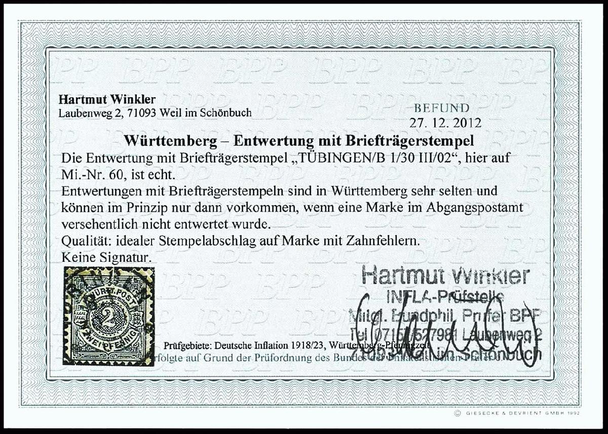 | Zusatzinformationen und Suchstichworte: | Dr. Reinhard Fischer 188. Auktion 1. - 3. September 2022 Los 1444 Altdeutschland Württemberg 2 Pfennig mit Entwertung durch Briefträgerstempel "Tübingen / B1 / 30 III/02", Entwertungen mit Briefträgerstempeln sind in Württemberg sehr selten und können im Prinzip nur dann vorkommen, wenn eine Marke im Abgangspostamt versehentlich nicht entwertetwurde, Marke mit Zahnfehlern, idealer Stempelabschlag, Fotobefund Winkler BPP Ausruf 30,00 EUR |