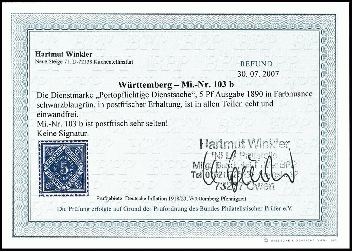 | Zusatzinformationen und Suchstichworte: | Dr. Reinhard Fischer 188. Auktion 1. - 3. September 2022 Los 1445 Altdeutschland Württemberg 5 Pfg schwarzblaugrün, tadellos postfrisch, unsigniert, Fotobefund Winkler BPP: "echt und einwandfrei. Mi.-Nr. 103 b ist postfrisch sehr selten!", Mi. 450.- (unterbewertet) Zuschlag 400,00 EUR |