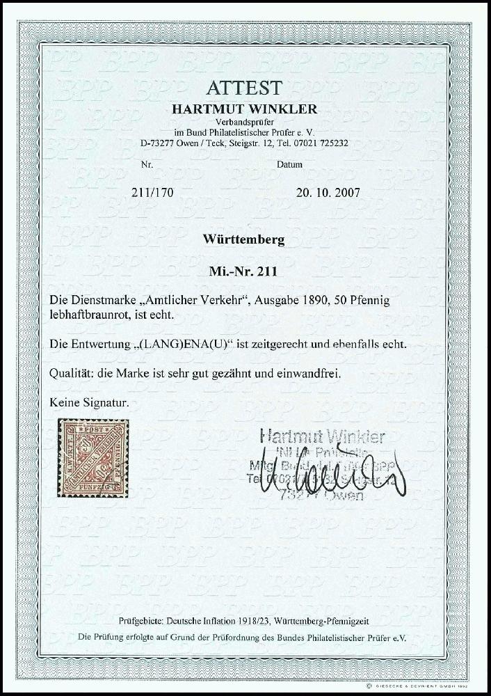 | Zusatzinformationen und Suchstichworte: | Dr. Reinhard Fischer 188. Auktion 1. - 3. September 2022 Los 1453 Altdeutschland Württemberg 50 Pfg Dienstmarke, lebhaftbraunrot, sauber gestempelt mit K1 "Langenau", tadellose Erhaltung, schönes Kabinettstück der echt gestempelt seltenen Marke, Fotoattest Winkler BPP: "echt und einwandfrei", Mi. 2.200.- Ausruf 500,00 EUR |