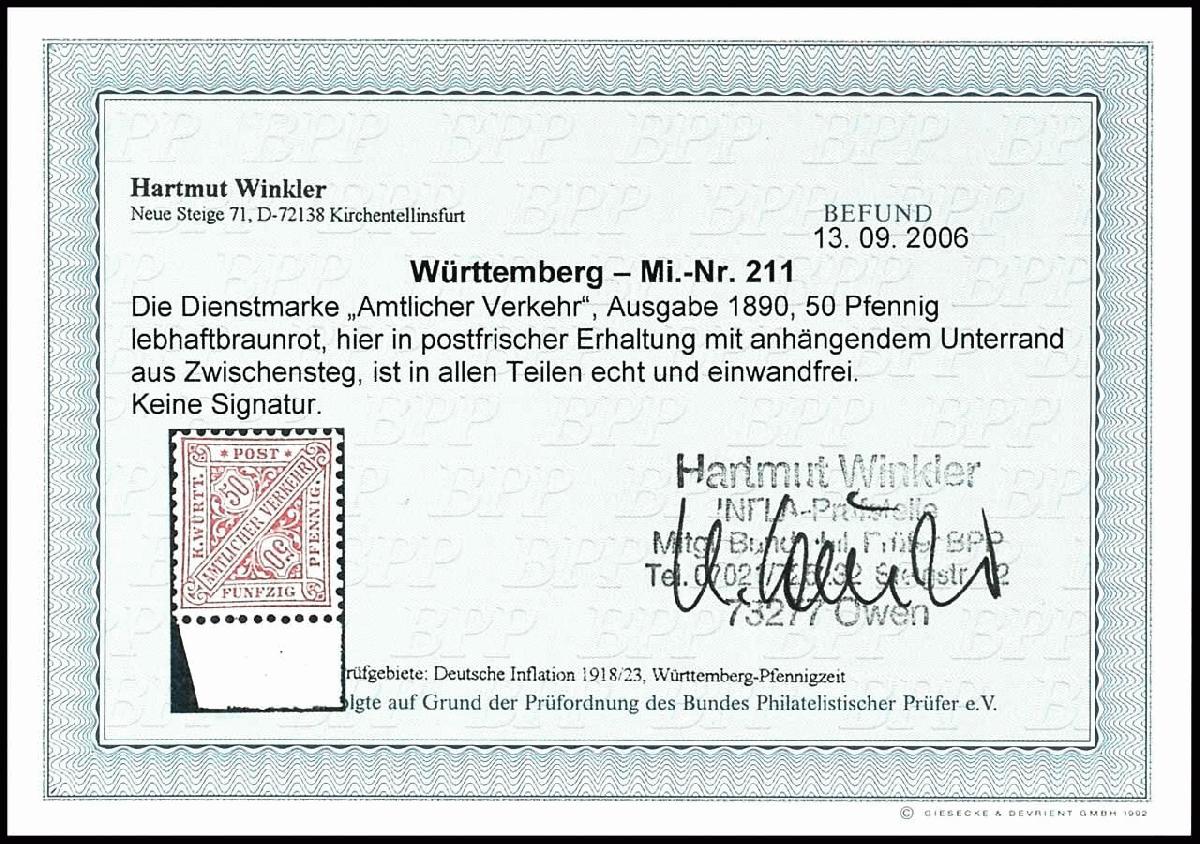 | Zusatzinformationen und Suchstichworte: | Dr. Reinhard Fischer 188. Auktion 1. - 3. September 2022 Los 1454 Altdeutschland Württemberg 50 Pfg lebhaftbraunrot, farbfrisches Kabinettstück, tadellos postfrisch, unsigniertes Unterrandstück, Fotobefund Winkler BPP: "echt und einwandfrei" Zuschlag 200,00 EUR |