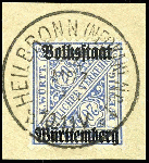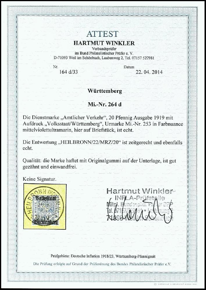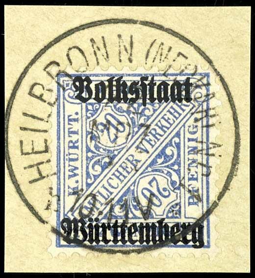 | Zusatzinformationen und Suchstichworte: | Dr. Reinhard Fischer 188. Auktion 1. - 3. September 2022 Los 1471 Altdeutschland Württemberg 20 Pfg "Amtlicher Verkehr" mit Aufdruck "Volksstaat Württemberg", mittelviolettultramarin, zeitgerecht gestempelt "Heilbronn 22 Mrz 20" auf Briefstück, tadellose Erhaltung, Fotoattest Winkler BPP: "echt und einwandfrei", Mi. 1.800.- - zeitgerecht entwertet eine sehr seltene Marke! Ausruf 600,00 EUR |