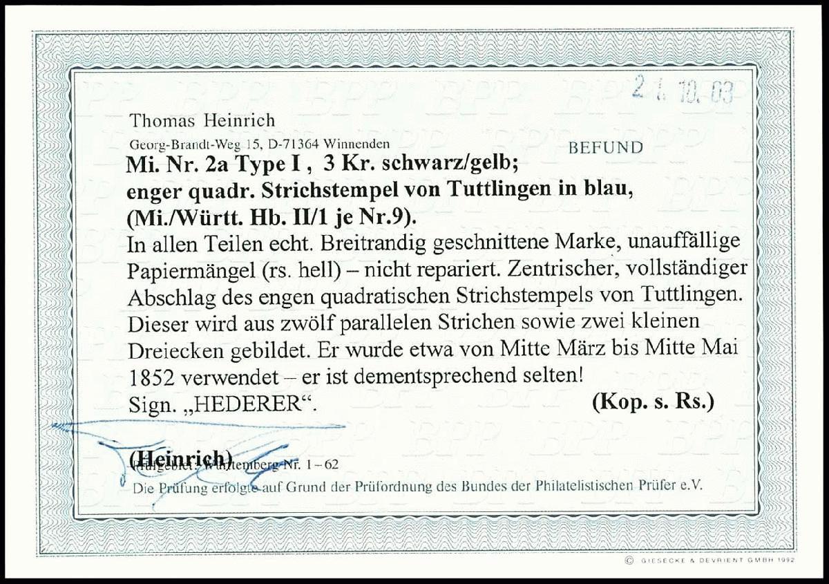 | Zusatzinformationen und Suchstichworte: | Dr. Reinhard Fischer 188. Auktion 1. - 3. September 2022 Los 1480 Altdeutschland Württemberg TUTTLINGEN, quadratischer enger Strichstempel, zentrisch auf 3 Kr. auf gelb, allseits breitrandig, rückseitig kleine helle Stelle, sign. Hederer, Fotobefund Heinrich BPP Zuschlag 280,00 EUR |