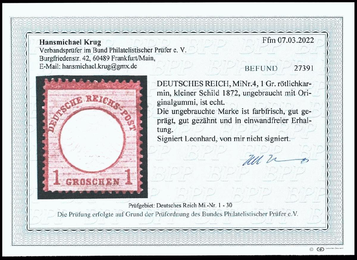 | Zusatzinformationen und Suchstichworte: | Dr. Reinhard Fischer 188. Auktion 1. - 3. September 2022 Los 1800 Deutsches Reich, 1872 Kleiner Brustschild 1 Groschen kleiner Schild, rötlichkarmin, tadellos ungebraucht, Fotobefund Krug BPP (2022): "in einwandfreier Erhaltung.", Mi. 400.- Zuschlag 190,00 EUR |