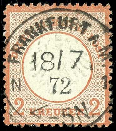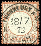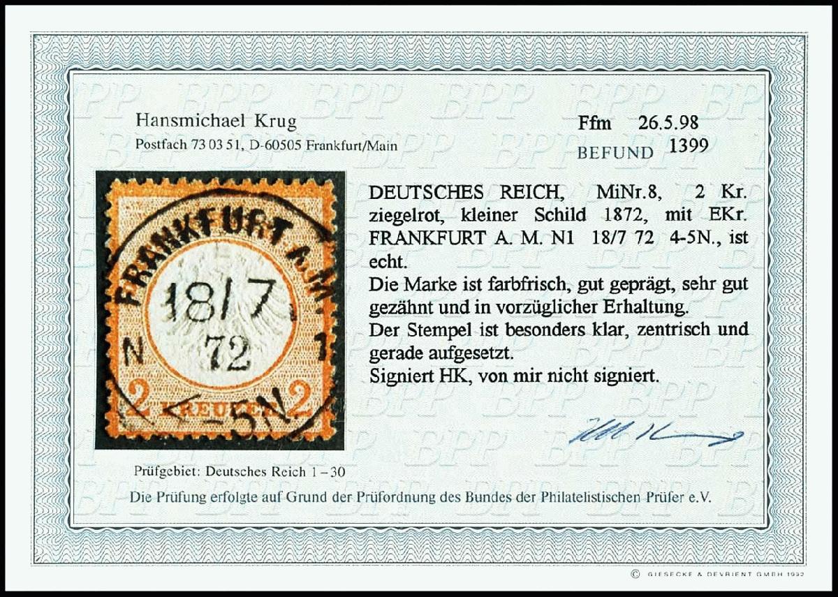 | Zusatzinformationen und Suchstichworte: | Dr. Reinhard Fischer 188. Auktion 1. - 3. September 2022 Los 1802 Deutsches Reich, 1872 Kleiner Brustschild 2 Kr. ziegelrot mit zentrischem und geraden Ekr. "FRANKFURT A.M. 18.7.72", Kabinett, Fotobefund Krug BPP, Mi. 400,-, ex Sammlung Höffen Zuschlag 130,00 EUR |