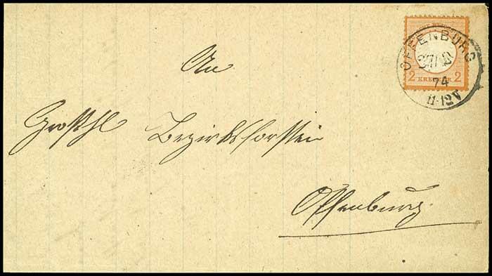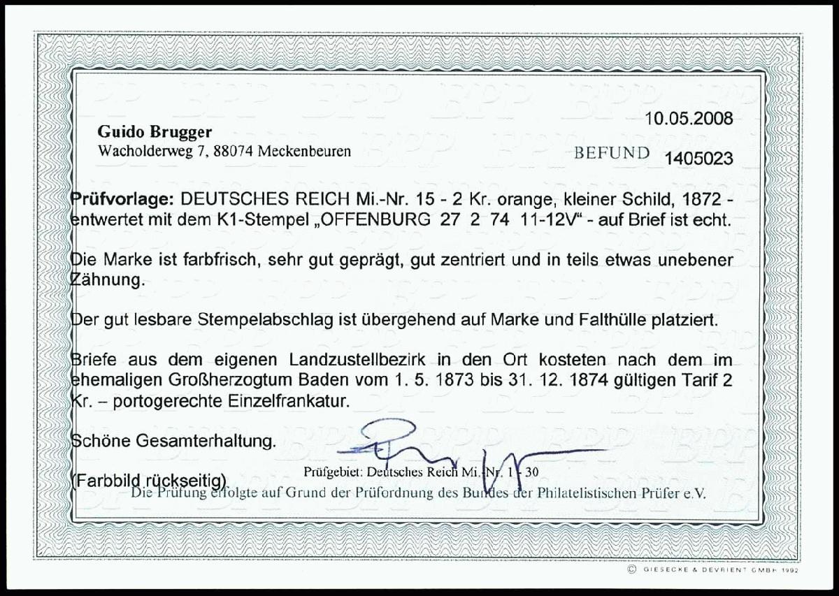 | Zusatzinformationen und Suchstichworte: | Dr. Reinhard Fischer 188. Auktion 1. - 3. September 2022 Los 1810 Deutsches Reich, 1872 Kleiner Brustschild 2 Kr. orange, teils etwas unebene Zähnung, auf portogerechtem Ortsbrief von "OFFENBURG 27.2.74" Fotobefund Brugger BPP, Mi. 650 Zuschlag 160,00 EUR |
