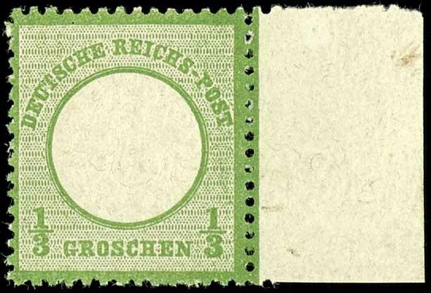 | Zusatzinformationen und Suchstichworte: | Dr. Reinhard Fischer 188. Auktion 1. - 3. September 2022 Los 1816 Deutsches Reich, 1872 Grosser Brustschild 1/3 Groschen großer Schild, dunkelgrün, vom rechten Bogenrand, raue Zähnung, tadellos postfrisch, unsigniert. Randstücke der Brustschilde sind selten! Fotoattest Krug BPP: "in einwandfreier Erhaltung. Raue Zähnung ist bei Marken mit großem Schild nicht häufig.", Mi. 600.- Ausruf 220,00 EUR |