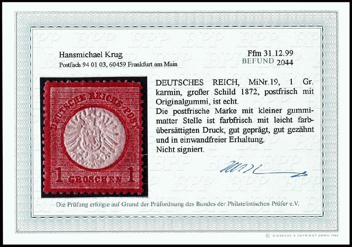 | Zusatzinformationen und Suchstichworte: | Dr. Reinhard Fischer 188. Auktion 1. - 3. September 2022 Los 1819 Deutsches Reich, 1872 Grosser Brustschild 1 Groschen großer Schild, karmin, tadellos postfrisch, Fotobefund Krug BPP, Mi. 300.- Ausruf 100,00 EUR |