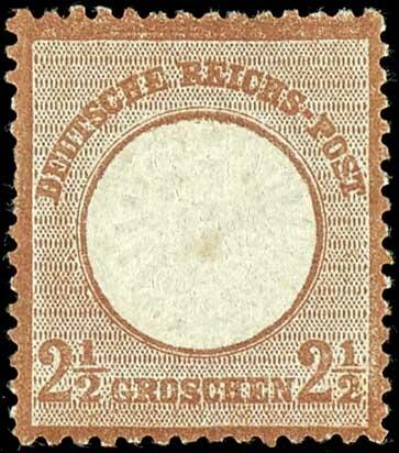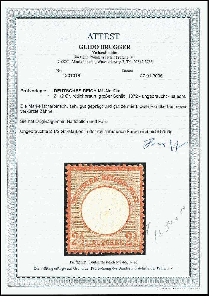 | Zusatzinformationen und Suchstichworte: | Dr. Reinhard Fischer 188. Auktion 1. - 3. September 2022 Los 1824 Deutsches Reich, 1872 Grosser Brustschild 2 1/2 Groschen großer Schild, rötlichbraun, ungebraucht mit Originalgummierung und Falz sowie Haftstellen, abgesehen von zwei Randkerben sowie verkürzten Zähnen gute Erhaltung, Fotoattest Brugger BPP, Mi. 2.600.- Ausruf 400,00 EUR |