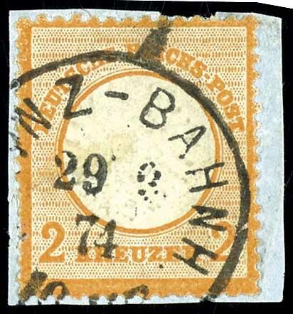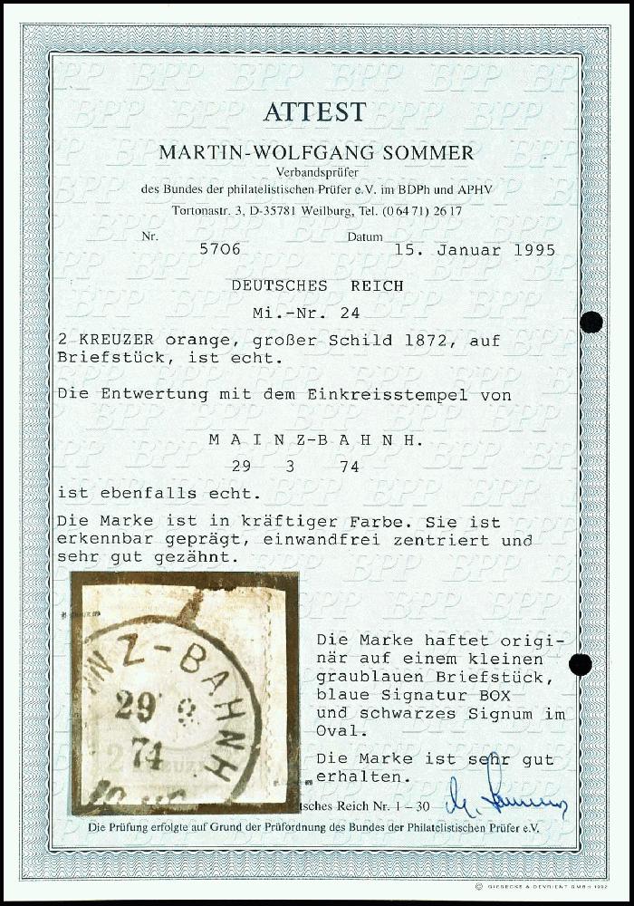| Zusatzinformationen und Suchstichworte: | Dr. Reinhard Fischer 188. Auktion 1. - 3. September 2022 Los 1831 Deutsches Reich, 1872 Grosser Brustschild 2 Kr. orange mit Ekr. "MAINZ-BAHNH. 29.3.74" auf Briefstück, Fotoattest Sommer BPP "Die Marke ist sehr gut erhalten", Mi. 3200,-, Zuschlag 1.300,00 EUR |