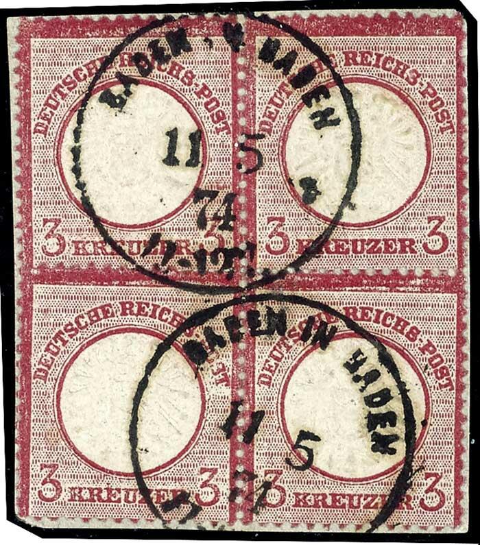 | Zusatzinformationen und Suchstichworte: | Dr. Reinhard Fischer 188. Auktion 1. - 3. September 2022 Los 1833 Deutsches Reich, 1872 Grosser Brustschild 3 Kr. großer Brustschild karmin, 3er-Block und Einzelmarke (als 4er-Block geklebt) auf Briefstück, zentrisch gestempelt mit nachverwendetem Baden-K1 "BADEN IN BADEN 11 5 74", farbfrisch und in tadelloser Erhaltung, dekorative und als Block nicht häufigeEinheit, Kabinett, gepr. Meier, Bühler und neuer Fotobefund Krug BPP (2020) "Alle Marken sind farbfrisch, deutlich geprägt, üblich gezähnt und in einwandfreier Erhaltung." Ausruf 100,00 EUR |