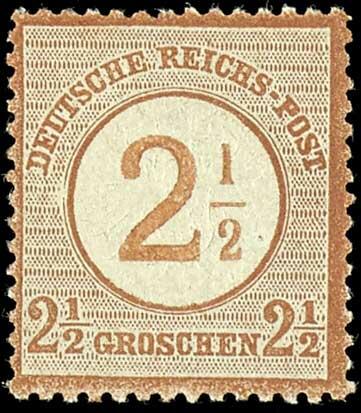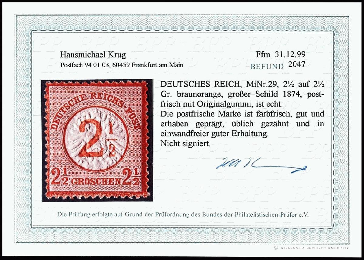 | Zusatzinformationen und Suchstichworte: | Dr. Reinhard Fischer 188. Auktion 1. - 3. September 2022 Los 1845 Deutsches Reich, 1872 Grosser Brustschild 2 1/2 auf 2 1/2 Groschen großer Schild, farbfrisches Luxusstück, tadellos postfrisch, Fotobefund Krug BPP: "in einwandfreier guter Erhaltung.", Mi. 120.- Zuschlag 60,00 EUR |