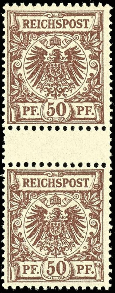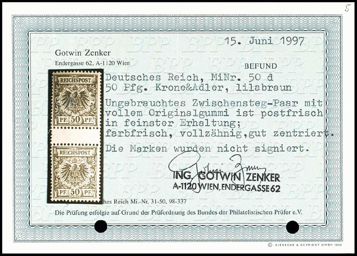 | Zusatzinformationen und Suchstichworte: | Dr. Reinhard Fischer 188. Auktion 1. - 3. September 2022 Los 1891 Deutsches Reich, 1889 Krone/Adler 50 Pfennig Krone/Adler, lilabraun, senkrechtes Zwischenstegpaar, tadellos postfrisch, Fotobefund Wiegand BPP: "Gute Erhaltung.", Mi. 500.- Ausruf 150,00 EUR |