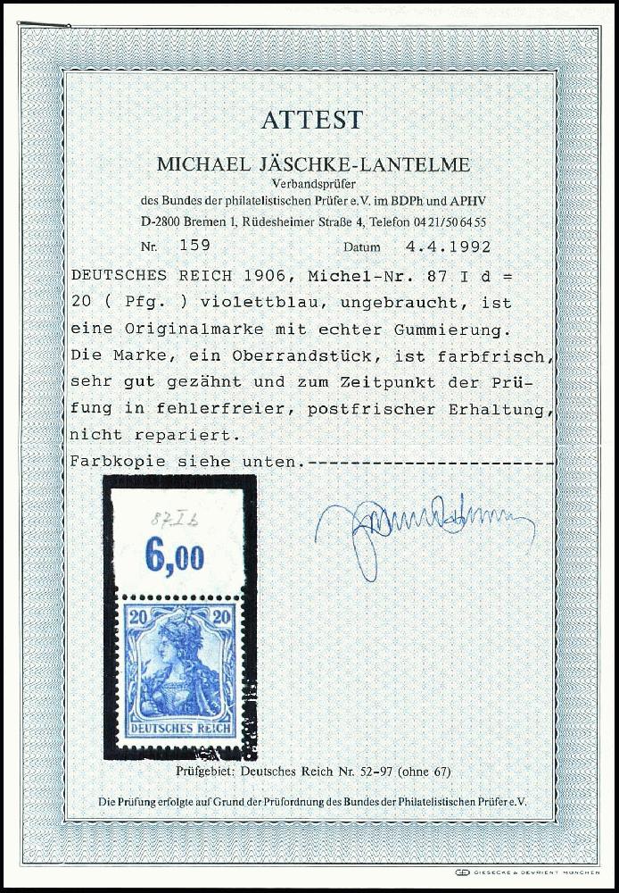 | Prüfgebiet: | Deutsches Reich 1871 - 1918 (Mi-Nr. 1 - 106) |