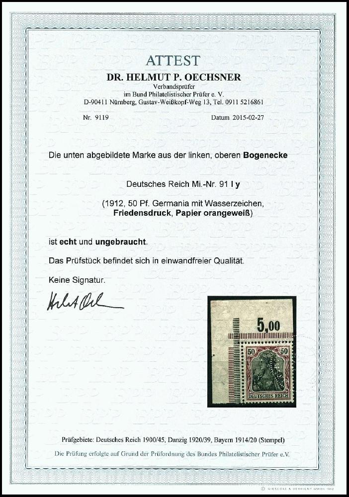 | Zusatzinformationen und Suchstichworte: | Dr. Reinhard Fischer 188. Auktion 1. - 3. September 2022 Los 1945 Deutsches Reich, Germania mit WZ 50 Pfg Germania, Friedensdruck, Papier orangeweiß, Eckrandstück oben links im Plattendruck, tadellos ungebraucht, Fotoattest Dr. Oechsner BPP: "in einwandfreier Qualität.", Mi. -.- (lose Marke schon 1.200.-) Ausruf 500,00 EUR |