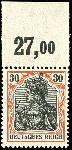 | Zusatzinformationen und Suchstichworte: | Dr. Reinhard Fischer 188. Auktion 1. - 3. September 2022 Los 1970 Deutsches Reich, Germania mit WZ 30 Pfg Germania, Kriegsdruck, dunkelrotorange/schwarz auf orangeweißem Papier, Plattendruckoberrandstück, tadellos postfrisch, gepr. Zenker und Fotobefund Jäschke-Lantelme BPP: "in fehlerfreier, postfrischer Erhaltung.", Mi. 250.- Ausruf 50,00 EUR |