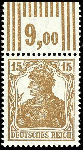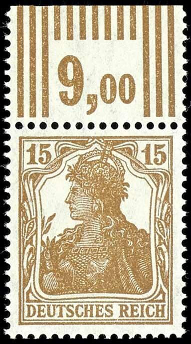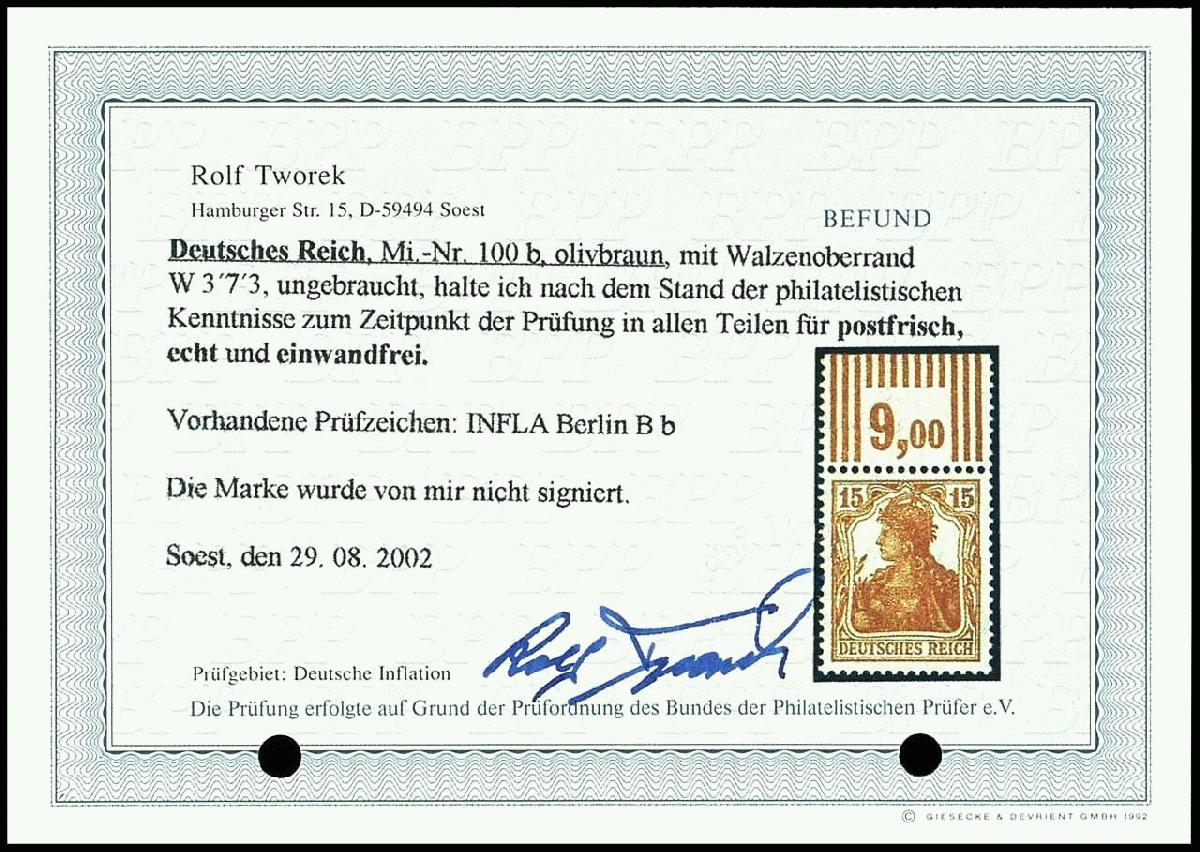 | Zusatzinformationen und Suchstichworte: | Dr. Reinhard Fischer 188. Auktion 1. - 3. September 2022 Los 2006 Deutsches Reich, Germania mit WZ 15 Pfennig Germania, olivbraun, Walzendruckoberrandstück, 3'7'3, tadellos postfrisch, Fotobefund Tworek BPP: "echt und einwandfrei", Mi. 450.- Zuschlag 90,00 EUR |