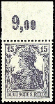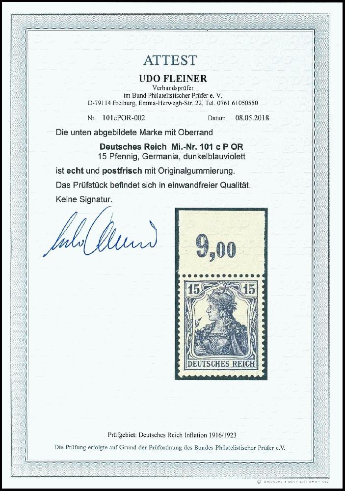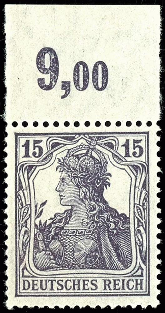 | Zusatzinformationen und Suchstichworte: | Dr. Reinhard Fischer 188. Auktion 1. - 3. September 2022 Los 2010 Deutsches Reich, Germania mit WZ 15 Pfg Germania, dunkelblauviolett, Plattendruckoberrandstück, tadellos postfrisch, unsigniert, Fotoattest Fleiner BPP: "echt und in einwandfreier Qualität.", Mi. 500.- Ausruf 100,00 EUR |