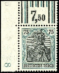 | Zusatzinformationen und Suchstichworte: | Dr. Reinhard Fischer 188. Auktion 1. - 3. September 2022 Los 2019 Deutsches Reich, Germania mit WZ 75 Pfg Germania, hellbläulichgrün/grünschwarz, Walzendruckoberrandstück in der seltenen Konfiguration 1'4'1/2'3'2, Eckrandstück oben links (Feld 1), tadellos postfrisch, unsigniert, Fotoattest Dr. Oechsner BPP: "in einwandfreier Qualität.", Mi. 3.500.- - sehr selten! Ausruf 800,00 EUR |