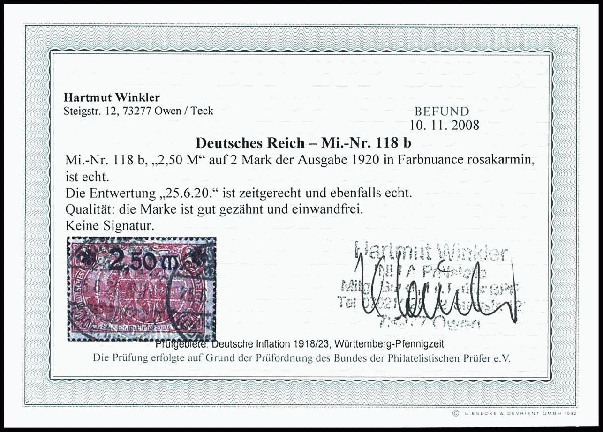 | Prüfgebiet: | Deutsches Reich 1919 - 1923 (Mi-Nr. 107 - 343) |
