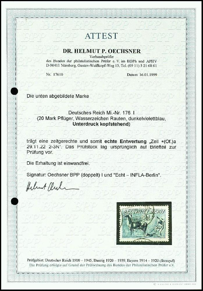 | Zusatzinformationen und Suchstichworte: | Dr. Reinhard Fischer 188. Auktion 1. - 3. September 2022 Los 2071 Deutsches Reich, 1918/23 Inflationsausgaben 20 Mark Pflüger, Abart "Unterdruck kopfstehend", tadellos gestempelt "Zell 29.11.22", Fotoattest Dr. Oechsner BPP: "Die Erhaltung ist einwandfrei.", Mi. 1.400.- - ein Stück dieser seltenen Marke können wir in gestempelter Erhaltung erstmalig anbieten Zuschlag 540,00 EUR |