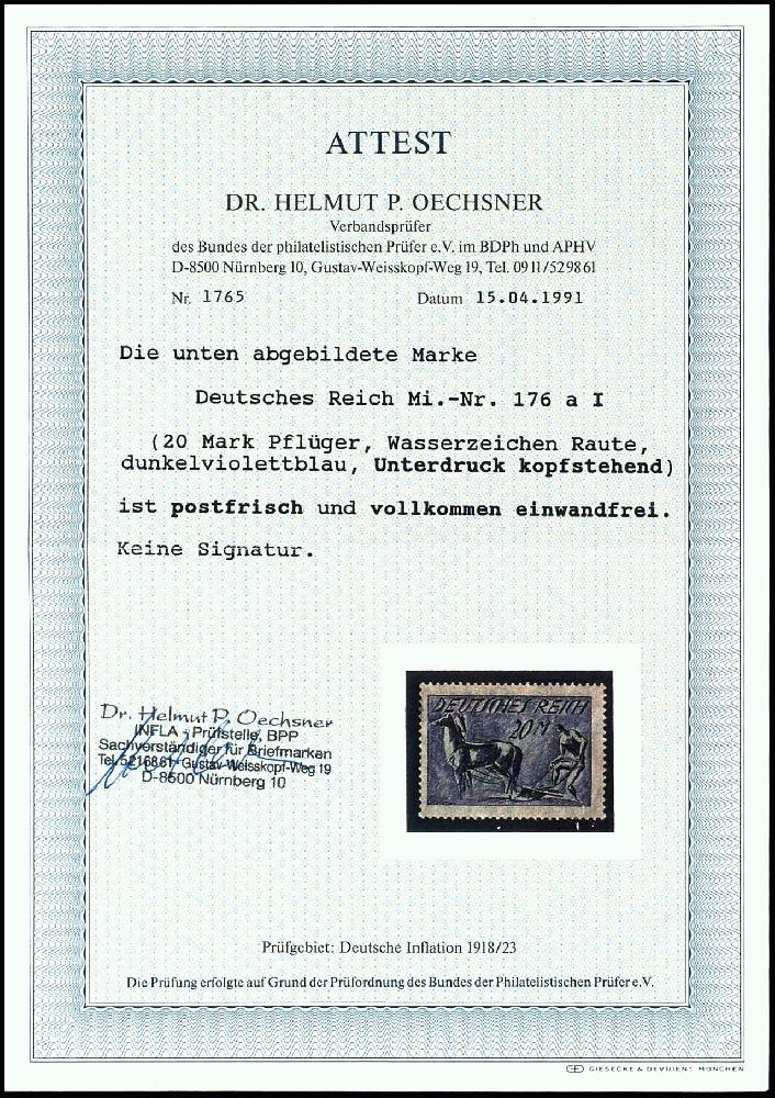 | Zusatzinformationen und Suchstichworte: | Dr. Reinhard Fischer 188. Auktion 1. - 3. September 2022 Los 2072 Deutsches Reich, 1918/23 Inflationsausgaben 20 Mark Pflüger, Abart "Unterdruck kopfstehend", tadellos postfrisch, Fotoattest Dr. Oechsner BPP: "vollkommen einwandfrei", Mi. 900.- Zuschlag 540,00 EUR |