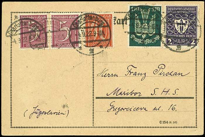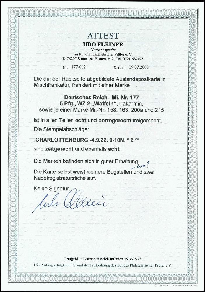 | Zusatzinformationen und Suchstichworte: | Dr. Reinhard Fischer 188. Auktion 1. - 3. September 2022 Los 2074 Deutsches Reich, 1918/23 Inflationsausgaben 5 Pfg. Wasserzeichen Waffeln mit Zusatzfrankatur auf portogerechter Karte von "CHARLOTTENBURG 4.9.22" nach Maribor/Jugoslawien, Karte kleinere Bugstellen und zwei Nadelregistraturstiche, Fotoattest Fleiner BPP Ausruf 100,00 EUR |