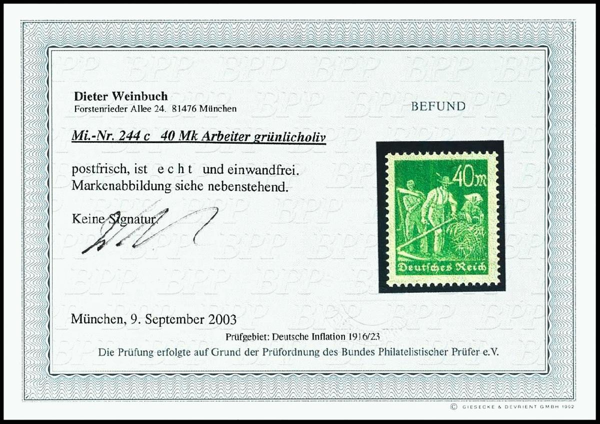 | Zusatzinformationen und Suchstichworte: | Dr. Reinhard Fischer 188. Auktion 1. - 3. September 2022 Los 2108 Deutsches Reich, 1918/23 Inflationsausgaben 40 Mark Arbeiter grünlicholiv, seltenste Farbe, tadellos postfrisch, unsigniert, Fotobefund Weinbuch BPP: "echt und einwandfrei", Mi. 800.- Zuschlag 250,00 EUR |