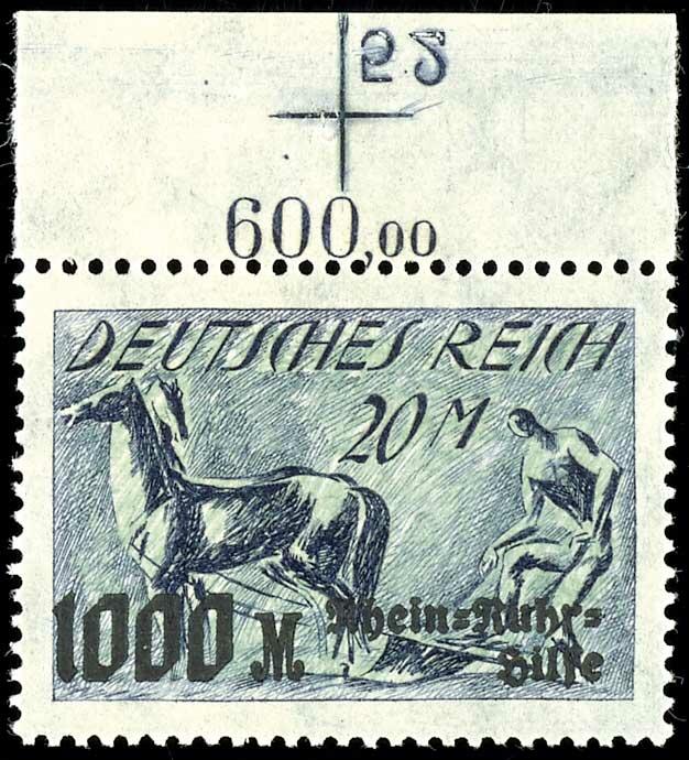 | Zusatzinformationen und Suchstichworte: | Dr. Reinhard Fischer 188. Auktion 1. - 3. September 2022 Los 2115 Deutsches Reich, 1918/23 Inflationsausgaben 1000 Mark Rhein-Ruhr-Hilfe, Abart "doppelter grüner Unterdruck, Plattendruckoberrandstück, Bogenfeld 3 mit Passerkreuz und Plattennummer "25" spiegelverkehrt", postfrisch, tadellose Erhaltung, Fotoattest Dr. Oechsner BPP: "echt und vollkommen einwandfrei.", Mi. 800.- - großer Unfug, diese Marke ist eine Fata Morgana der Infla-Philatelie und wurde in den letzten Jahren nicht angeboten, was auch ein Schreiben eines BPP Prüfers welches beiliegt bescheinigt, eigentlich sollte die Marke aufgrund mangelndem Angebots im Katalog mit -.- notiert werden Zuschlag 900,00 EUR |
