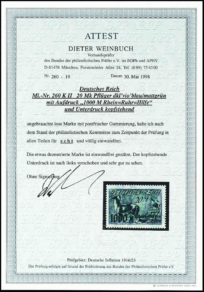 | Zusatzinformationen und Suchstichworte: | Dr. Reinhard Fischer 188. Auktion 1. - 3. September 2022 Los 2116 Deutsches Reich, 1918/23 Inflationsausgaben 20 Mark Rhein-Ruhrhilfe, kopfstehender Unterdruck, postfrisch, Fotoattest Weinbuch BPP: "echt und einwandfrei", Mi. 1.000.- Ausruf 200,00 EUR |