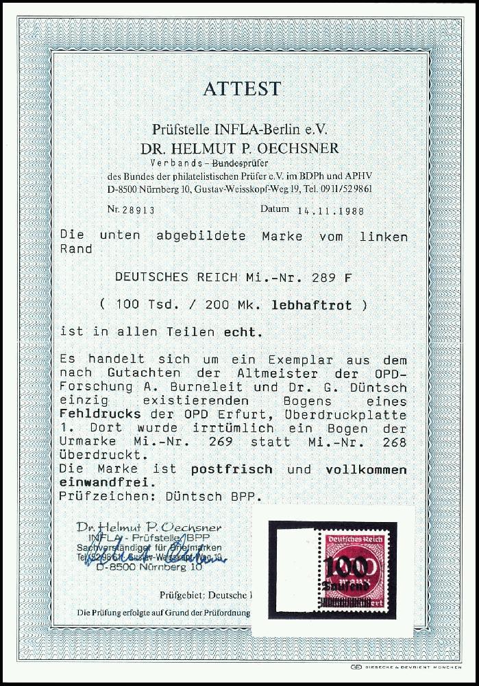 | Zusatzinformationen und Suchstichworte: | Dr. Reinhard Fischer 188. Auktion 1. - 3. September 2022 Los 2121 Deutsches Reich, 1918/23 Inflationsausgaben 100 Tsd. auf 200 Mark lebhaftrot, Fehldruck der OPD Erfurt auf einem Bogen der Mi.-Nr. 269 anstatt 268, vom Bogenrand links, tadellos postfrisch, Auflage nur 100 Stück!, gepr. Düntsch BPP und Fotoattest Dr. Oechsner BPP: "postfrisch und vollkommen einwandfrei.", Mi. 3.500.- - sehr seltenes Stück der Infla-Philatelie! Ausruf 1.000,00 EUR |