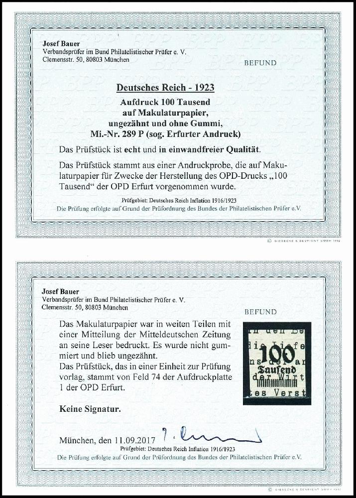 | Zusatzinformationen und Suchstichworte: | Dr. Reinhard Fischer 188. Auktion 1. - 3. September 2022 Los 2122 Deutsches Reich, 1918/23 Inflationsausgaben 100 Tausend sog. Erfurter Andruck auf Makulaturpapier (vorgesehen für die Marken Nr. 289 und 290), Feld 74 der Aufdruckplatte, tadellos ungebraucht ohne Gummi, wie verausgabt, Fotobefund Bauer BPP: "echt und in einwandfreier Qualität." Zuschlag 120,00 EUR |