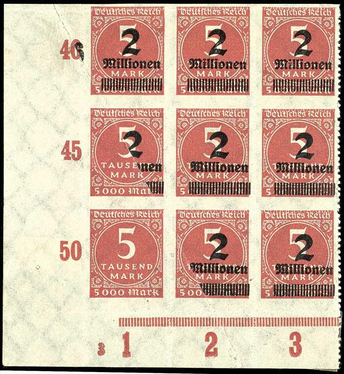 | Zusatzinformationen und Suchstichworte: | Dr. Reinhard Fischer 188. Auktion 1. - 3. September 2022 Los 2138 Deutsches Reich, 1918/23 Inflationsausgaben 2 Millionen auf 5 Mark, Abart "ohne Aufdruck", durchstochen, Einheit zu neun Werten, die untere linke Eckmarke ohne Aufdruck (durch Bogenumschlag), ungebraucht mit drei Falzen, die Abart ohne Falz mit zarter Fingerspur, selten und kaum einmal angeboten, Fotoattest Tworek BPP Zuschlag 200,00 EUR |