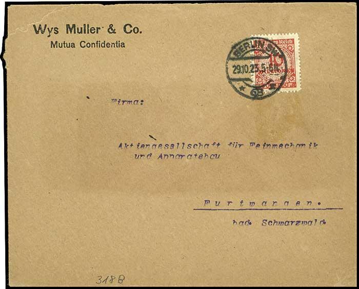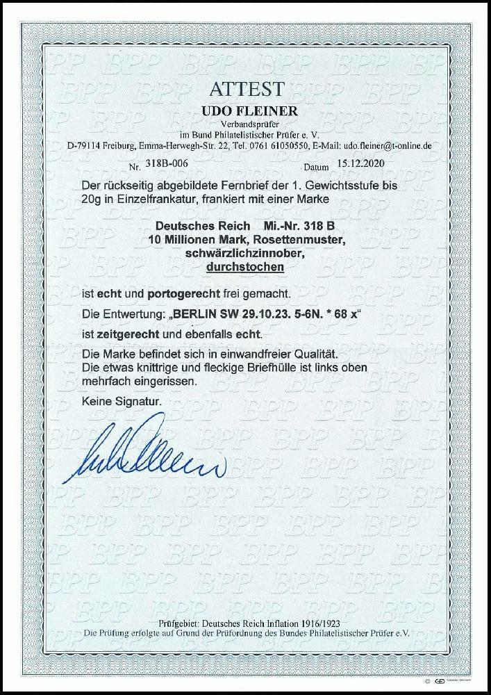 | Zusatzinformationen und Suchstichworte: | Dr. Reinhard Fischer 188. Auktion 1. - 3. September 2022 Los 2141 Deutsches Reich, 1918/23 Inflationsausgaben 10 Mio. M. durchstochen auf portogerechtem Brief von "BERLIN 29.10.23" nach Furtwangen, die etwas knittrige und fleckige Briefhülle ist links oben mehrfach eingerissen, Fotoattest Fleiner BPP, Mi. 500,-uschlag 70,00 EUR |
