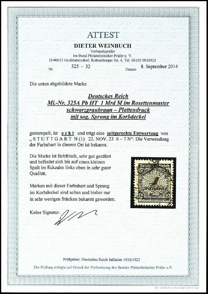 | Zusatzinformationen und Suchstichworte: | Dr. Reinhard Fischer 188. Auktion 1. - 3. September 2022 Los 2148 Deutsches Reich, 1918/23 Inflationsausgaben 1 Mrd. M. in der seltenen Type APb schwarzbraun mit Plattenfehler "Sprung im Korbdeckel", zentrisch und zeitgerecht gestempelt "STUTTGART 22. NOV. 23", gut gezähnt, winziger Spalt im Eckzahn links oben nahezu ohne Belang, echt gestempelte Marken dieser Type gehören zu den großen Infla-Seltenheiten, Stücke die zusätzlich noch den populären Plattenfehler aufweisen sind bis dato nur vereinzelt bekannt geworden, Fotoattest Weinbuch BPP (2014) "echt und zeitgerechte Entwertung", Mi. 9.000.-++ Ausruf 4.000,00 EUR |