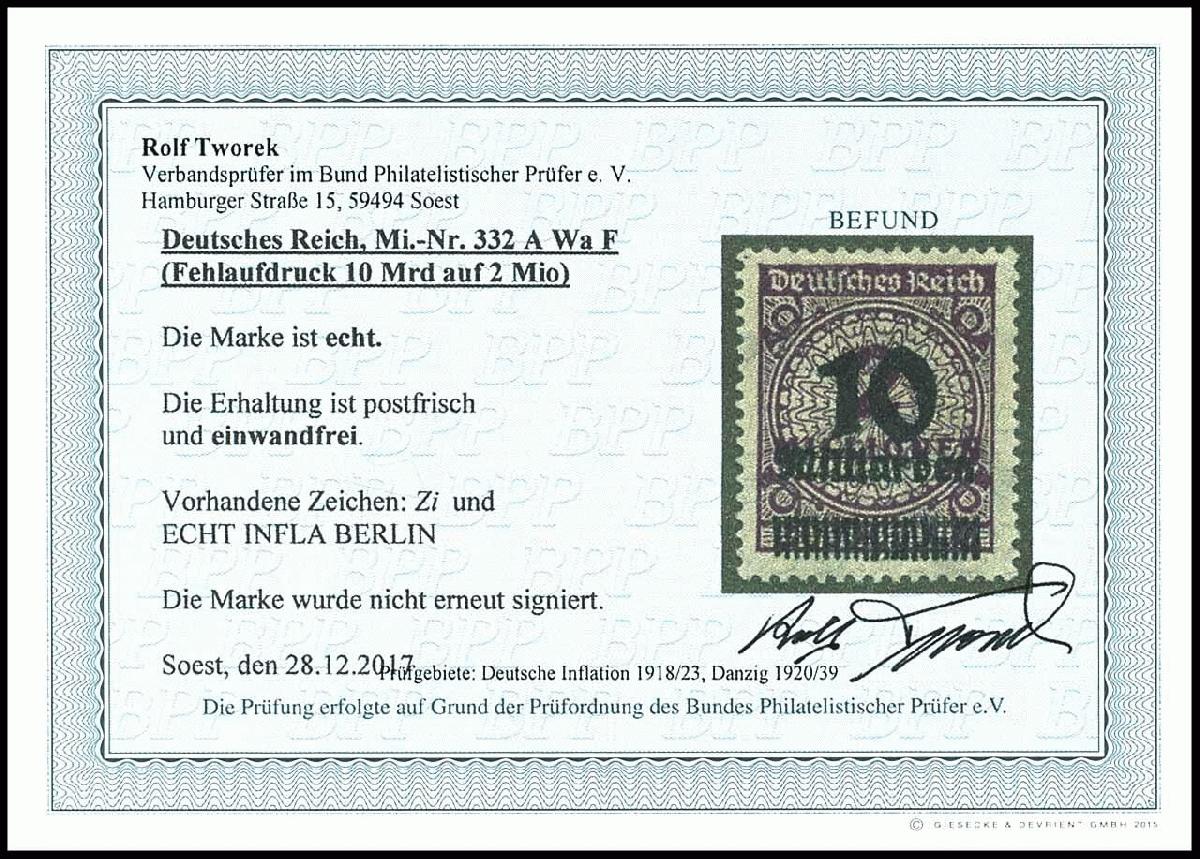 | Zusatzinformationen und Suchstichworte: | Dr. Reinhard Fischer 188. Auktion 1. - 3. September 2022 Los 2157 Deutsches Reich, 1918/23 Inflationsausgaben 10 Milliarden auf 2 Millionen Mark, Fehlaufdruck, tadellos postfrisch, Fotobefund Tworek BPP: "echt und einwandfrei", Mi. 300.- Zuschlag 170,00 EUR |