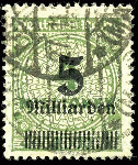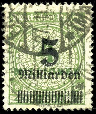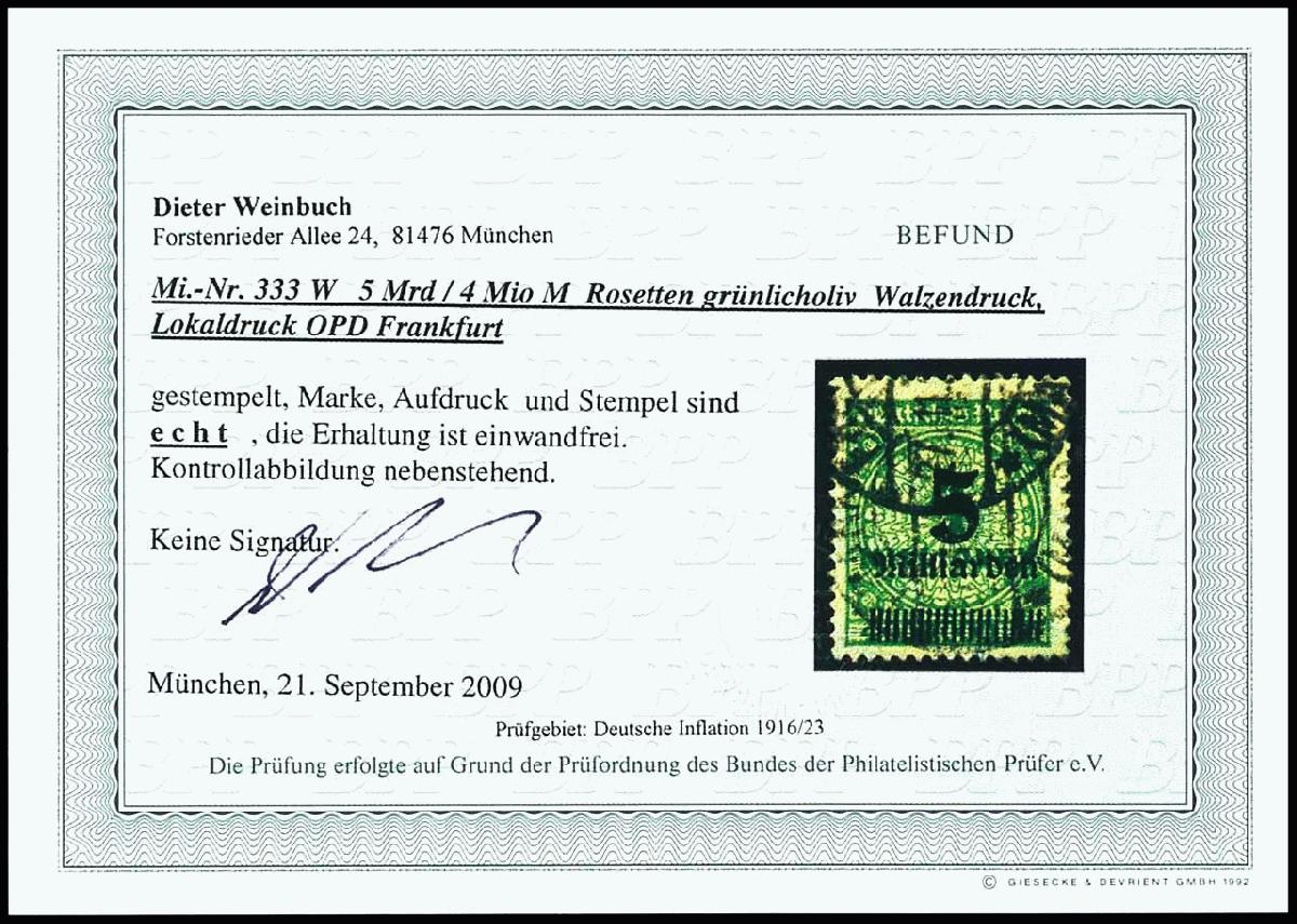 | Zusatzinformationen und Suchstichworte: | Dr. Reinhard Fischer 188. Auktion 1. - 3. September 2022 Los 2159 Deutsches Reich, 1918/23 Inflationsausgaben 5 Milliarden auf 4 Millionen grünoliv, Walzendruck OPD Frankfurt, gestempelt, Fotobefund Weinbuch BPP "echt und einwandfrei", Mi. 450.- Ausruf 100,00 EUR |