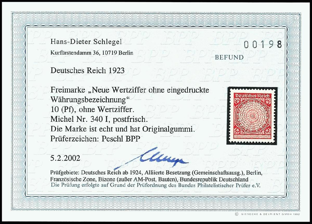 | Prüfgebiet: | Deutsches Reich 1919 - 1923 (Mi-Nr. 107 - 343) |