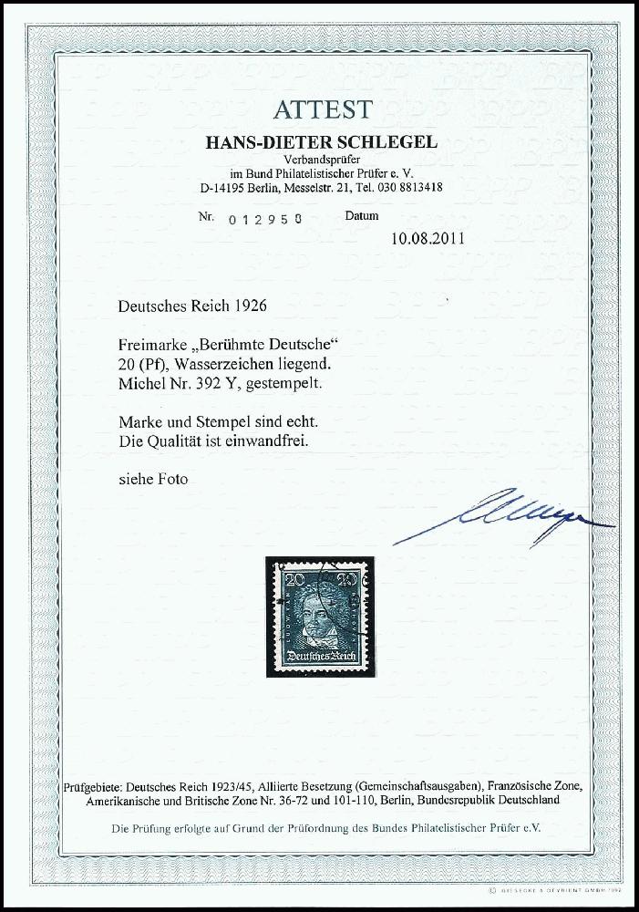 | Zusatzinformationen und Suchstichworte: | Dr. Reinhard Fischer 188. Auktion 1. - 3. September 2022 Los 2203 Deutsches Reich, 1923/32 Weimarer Republik 20 Pfg grünblau, WZ 2Y (liegend), gestempelt, tadellose Erhaltung, Fotoattest H.-D. Schlegel BPP: "Die Qualität ist einwandfrei.", Mi. 550.- - seltene Marke! Zuschlag 165,00 EUR |
