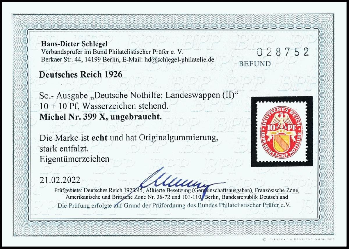 | Zusatzinformationen und Suchstichworte: | Dr. Reinhard Fischer 188. Auktion 1. - 3. September 2022 Los 2208 Deutsches Reich, 1923/32 Weimarer Republik 10 Pfg "Wappen Baden", Wz. 2 stehend, ungebraucht mit Originalgummierung (stark entfalzt), Fotobefund H.-D. Schlegel BPP, Mi. für ** 1.700.- Ausruf 80,00 EUR |