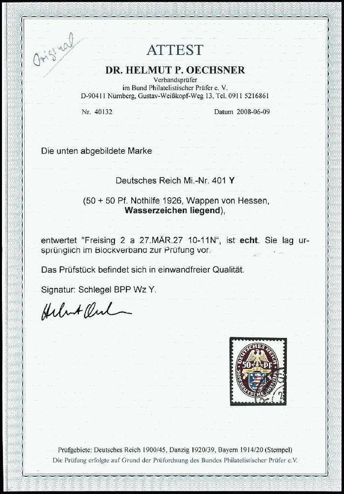 | Zusatzinformationen und Suchstichworte: | Dr. Reinhard Fischer 188. Auktion 1. - 3. September 2022 Los 2211 Deutsches Reich, 1923/32 Weimarer Republik 50 Pfg Nothilfe 1926 Wappen "HESSEN", Wz. liegend, tadellos entwertet "FREISING 2 a 27.MÄR.27" (Teilabschlag), ein fantastisches Stück dieser seltenen Marke in tadelloser Erhaltung, welche in fast jeder Deutschen Reich Sammlung fehlt! Es sind nur ca. 40Exemplare in gestempelter Erhaltung bekannt, gepr. Schlegel BPP und Fotoattest Dr. Oechsner BPP (2008): "befindet sich in einwandfreier Qualität.", Mi. 5.500.- - eine selten angebotene Marke! Zuschlag 3.000,00 EUR |