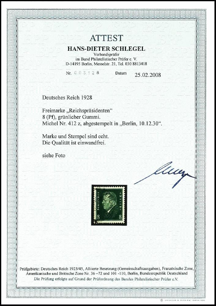 | Zusatzinformationen und Suchstichworte: | Dr. Reinhard Fischer 188. Auktion 1. - 3. September 2022 Los 2226 Deutsches Reich, 1923/32 Weimarer Republik 8 Pfg Ebert, Abart "mit grünlichem Gummi", tadellos gestempelt "BERLIN 10.12.30", Fotoattest H.-D. Schlegel BPP: "Die Qualität ist einwandfrei.", Mi. 800.- - seltene Marke, die wir seit unserer 112. Auktion trotz zahlreicher großer Deutsches Reich Sammlungen die wir auflösen durften nicht mehr anbieten konnten! Zuschlag 700,00 EUR |
