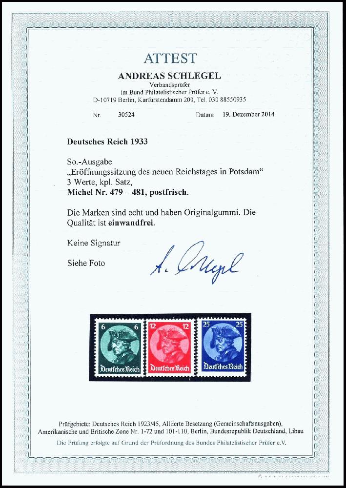 | Zusatzinformationen und Suchstichworte: | Dr. Reinhard Fischer 188. Auktion 1. - 3. September 2022 Los 2257 Deutsches Reich, 1933/45 Drittes Reich 6 Pfg bis 25 Pfg "Eröffnungssitzung des neuen Reichstages in Potsdam", kompletter Satz mit drei Werten, tadellos postfrisch, Fotoattest A.. Schlegel BPP (2014): "Die Qualität ist einwandfrei.", Mi. 320.- Ausruf 80,00 EUR |